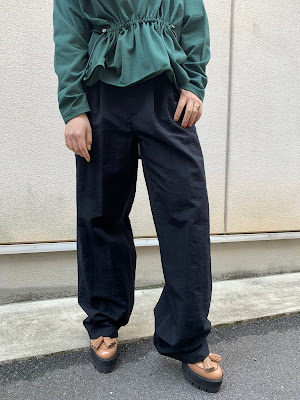 軽量でシワになりにくい素材のタックワイドパンツ。